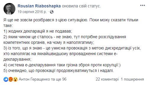 Сам Рябошапка зазначив, що жодних декларацій не подавав.