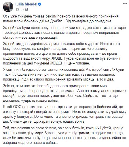 Мендель акцентувала увагу суспільства на тому, що за цей тиждень серед українських військовослужбовців не було втрат. Сама армія України проявила свою мудрість, не піддаючись на провокації супротивника.