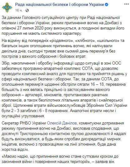 Таку заяву РНБО було опубліковано її пресслужбою у Facebook в понеділок увечері, 3 серпня. В РНБО нагадали, що режим тиші був введений у понеділок, 27 липня. "На відміну від попередніх "різдвяного", "хлібного", "шкільного" і багатьох інших оголошених припинень вогню, які налічували кілька днів, сьогодні йде вже сьомий день перемир'я без пострілів з важкого озброєння і бойових втрат", - підкреслили в РНБО.