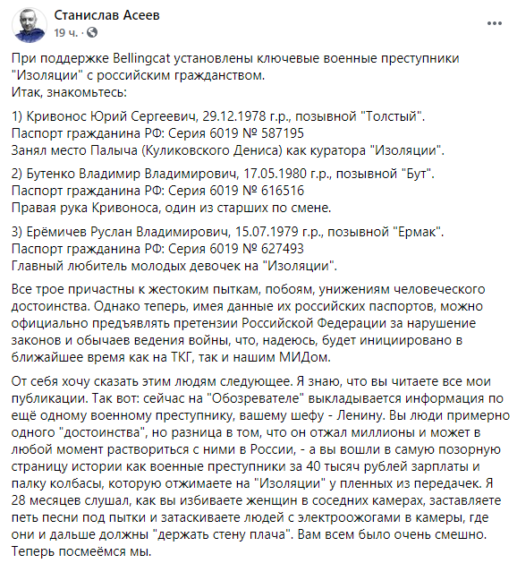 Станіслав Асєєв опублікував фото і документи військових злочинців, які виявилися громадянами Росії. Це Кривоніс Юрій Сергійович, Бутенко Володимир Володимирович. Бутенко називають "головним любителем" молодих дівчат у в'язниці.