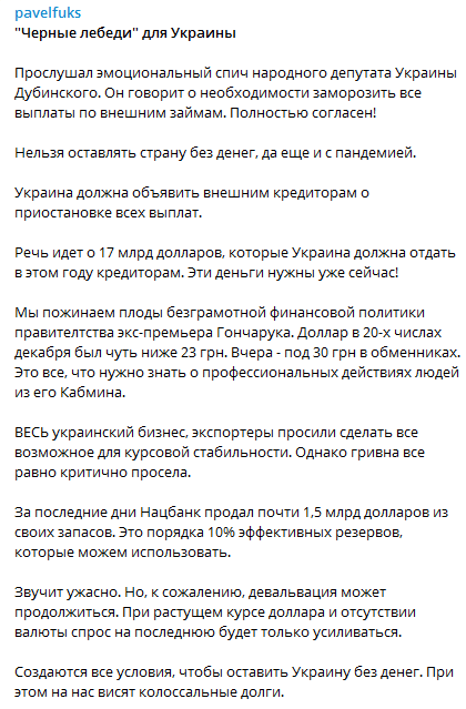 Відомий бізнесмен і меценат Павло Фукс у своєму Телеграм-каналі написав, що солідарний з думкою нардепа Дубінського про необхідність заморозити всі виплати за зовнішніми позиками.