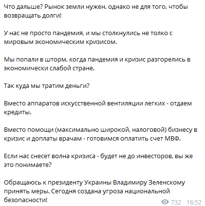 "Звучить жахливо. Але, на жаль, девальвація може продовжитися. При зростанні курсу долара і відсутності валюти попит на останню буде тільки посилюватися. Створюються всі умови, щоб залишити Україну без грошей. При цьому на нас висять колосальні борги. Що далі? Ринок землі потрібен, проте не для того, щоб повертати борги! У нас не просто пандемія, і ми зіткнулися не тільки зі світовою економічною кризою", - зазначає Фукс.