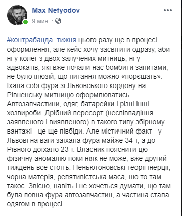 "Власник пояснити цю фізичну аномалію поки ніяк не може, вже другий тиждень все стоїть… Звісно, навіть і не хочеться думати, що там була повна фура автозапчастин, а частина стала одягом в процесі", - написав Нефьодов на своїй сторінці у Facebook.
