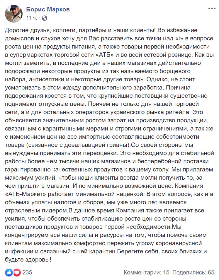 «Подібні ситуації можна спостерігати в більшості магазинів мережевих рітейлерів. Нам піднімають ціни на товари, оскільки зростає собівартість виробництва продукції. Карантин і обмеження зробили «поштовх» для подорожчання, в основному, імпортних товарів. Ми й так намагаємося встановлювати мінімальні націнки, але нові цінники - це необхідність. Ми йдемо на додаткові витрати для забезпечення нашої повсякденної роботи - забезпечили підвезення співробітників транспортом і проводимо регулярну дезінфекцію в магазинах. Хочу вас запевнити, що у нас достатньо запасів, щоб задовольнити запити всіх покупців».