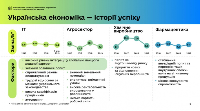 Серед найуспішніших сфер української економіки можна назвати IT-сектор, аграрний сектор, хімічне виробництво та фармацевтика.