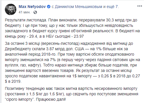 Голова Державної митної служби України Максим Нефьодов розповів на своїй сторінці у Facebook, що за результатами листопада митниця план виконала, перерахували 30,3 млрд грн до бюджету.