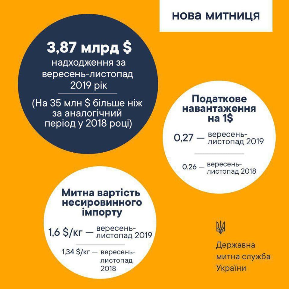 "За останні 3 місяці (вересень-листопад) надходження від митниці до Держбюджету склали 3.87 млрд дол. США — на 1% більше ніж за аналогічний період 2018-го. При тому вартісні обсяги оподаткованого імпорту зменшилися на 7% (в першу чергу через падіння світових цін на вугілля, газ, нафту). Тобто наразі митниця збирає більше податків, при зменшенні вартості ввезених товарів. Як результат за останні місяці зросло податкове навантаження на 1$ імпорту — з 0,26 $ в 2018 до 0,27 $ в 2019", - розповів Нефьодов.
