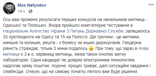 "Вчора пройшло комп’ютерне тестування в Національне Агентство Украіни З Питань Державноі Служби, залишилось 33 претенденти на Одесу та 15 на Полісся. Дві третини - це митники, нинішні та колишні, решта - з бізнесу чи інших держорганів. Гендерна рівність страждає, тільки 3 жінки подалось", - написав Нефьодов.