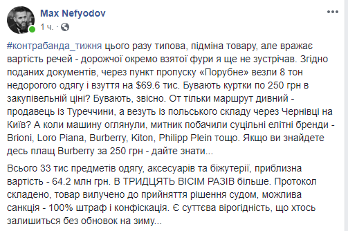 "Згідно поданих документів, через пункт пропуску "Порубне" везли 8 тон недорогого одягу і взуття на $69.6 тис. Бувають куртки по 250 грн в закупівельній ціні? Бувають, звісно. От тільки маршрут дивний - продавець із Туреччини, а везуть із польського складу через Чернівці на Київ? А коли машину оглянули, митники побачили суцільні елітні бренди - Brioni, Loro Piana, Burberry, Kiton, Philipp Plein тощо. Якщо ви знайдете десь плащ Burberry за 250 грн - дайте знати", - написав Нефьодов.