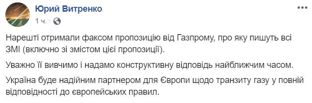 "Нарешті отримали факсом пропозицію від Газпрому, про яку пишуть всі ЗМІ (включно зі змістом цієі пропозиції). Уважно її вивчимо і надамо конструктивну відповідь найближчим часом", - написав Вітренко.