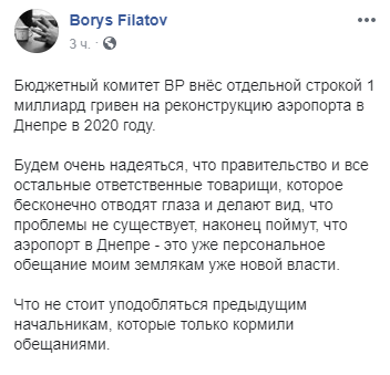 "Будемо сподіватися, що уряд і всі інші відповідальні товариші, які нескінченно відводять очі і роблять вигляд, що проблеми не існує, нарешті зрозуміють, що аеропорт в Дніпрі - це вже персональна обіцянку моїм землякам вже нової влади. Не варто уподібнюватися попереднім начальникам, які тільки годували обіцянками", - написав Філатов.