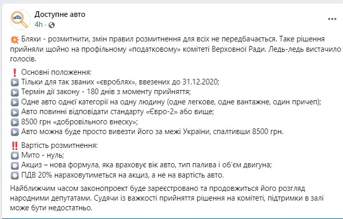Відповідно до документу, для тих, хто ввозить в Україну авто на європейських номерах потрібно буде протягом 180 днів із моменту ухвалення нового закону (сам документ ще не розробили) виплатити "внесок" у розмірі 8,5 тисяч гривень і розмитнити авто за пільговими умовами.
