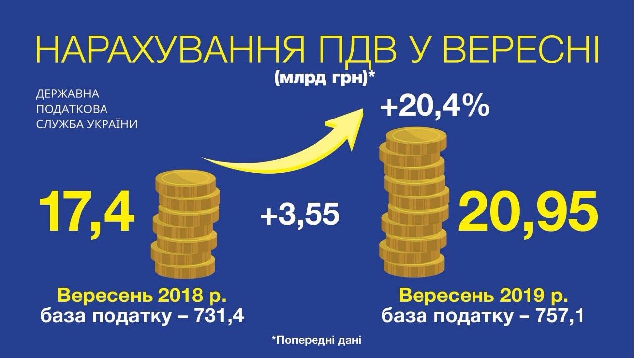 У вересні, за попередніми даними, нарахування ПДВ загалом склали 20,95 млрд грн, що на 3,55 млрд грн, або на 20,4% більше, ніж у вересні минулого року (17,4 млрд грн).