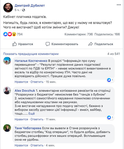 "Напишіть, будь ласка, в коментарях, що вас не влаштовує в електронному кабінеті платника податків ? Чого не вистачає? Щоб хотіли змінити? Дякую!".