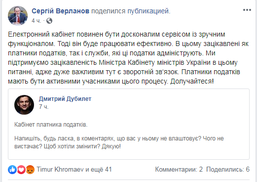 Зокрема, він зазначив: "Електронний кабінет повинен бути досконалим сервісом із зручним функціоналом. Тоді він буде працювати ефективно. В цьому зацікавлені як платники податків, так і служби, які ці податки адмініструють. Ми підтримуємо зацікавленість Міністра Кабінету міністрів України в цьому питанні, адже дуже важливим тут є зворотній зв‘язок. Платники податків мають бути активними учасниками цього процесу. Долучайтеся!"