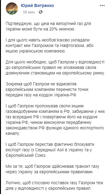 "Для цього необхідно, щоб Газпром у відповідності до європейських правил не зловживав своїм домінуючим становищем на європейському ринку. Зокрема щоб Газпром не відмовляв європейським компаніям перенести точки передачі газу на кордон Україна-РФ. І щоб Газпром пропонував свопи іншим газовидобувним компаніям в РФ, забираючи у них газ всередині РФ і повертаючи його на кордоні Україна-РФ, таким чином виконуючи передбачену законодавством РФ функцію єдиного експортного каналу", - написав Вітренко на своїй сторінці у Facebook.