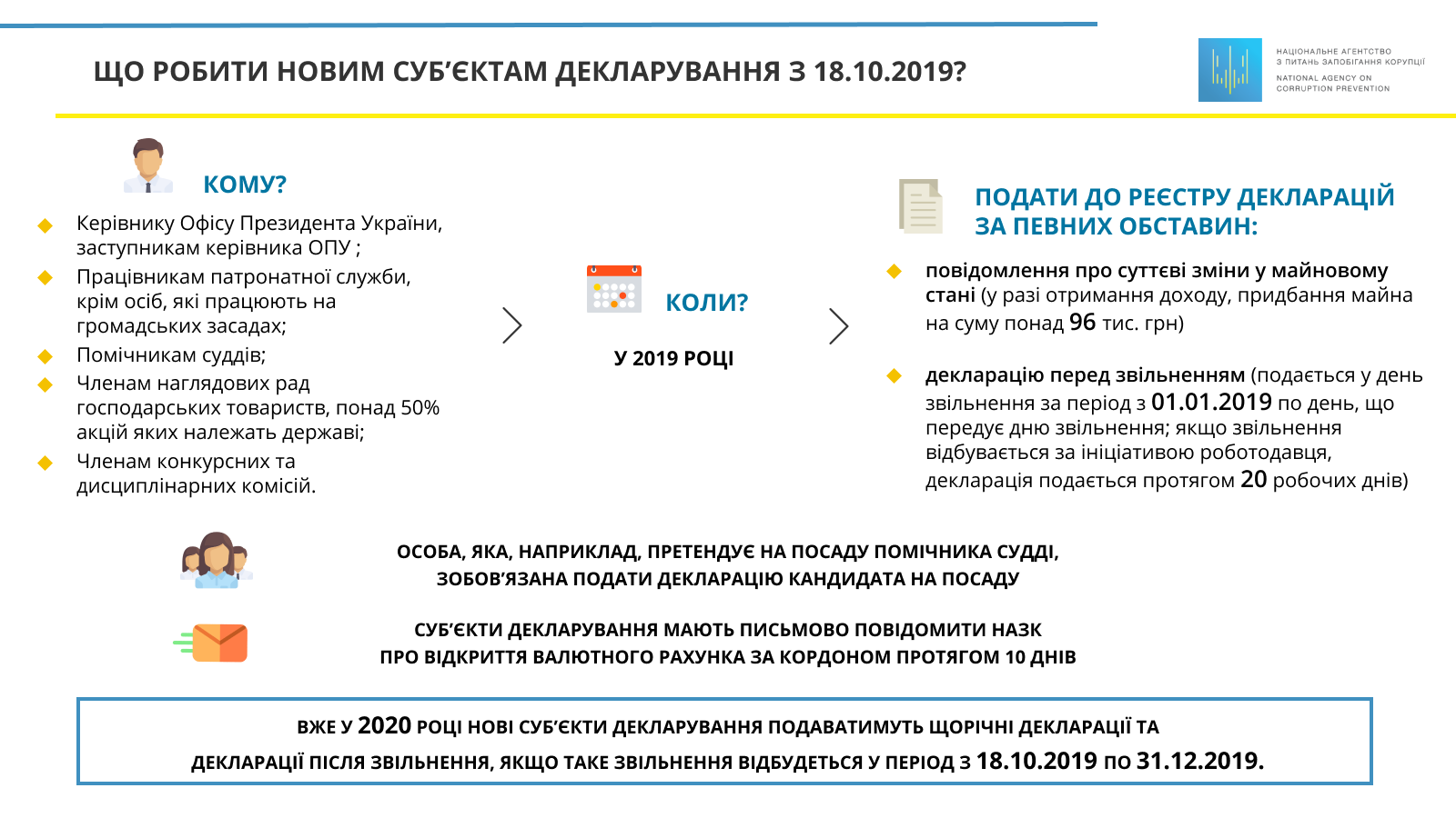 Нові суб'єкти декларування: Керівник Офіса Президента України, заступники керівника ОПУ; працівники патронатної служби (крім осіб, які працюють на громадських засадах); помічники суддів; члени наглядових рад господарських товариств, понад 50% акцій яких належать державі; члени конкурсних та дисциплінарних комісій - подають в 2019 році до Реєстру декларацій: