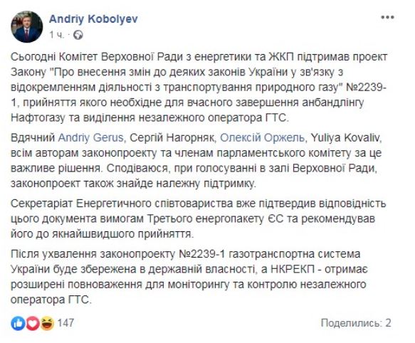 Як написав Коболєв, прийняття законопроєкту необхідно для своєчасного завершення анбандлінгу "Нафтогазу" і виділення незалежного оператора української газотранспортної системи.