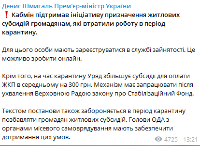 Кабмін підтримав ініціативу призначення житлових субсидій громадянам, які втратили роботу в період карантину. Про це в Телеграм-каналі заявив прем'єр-міністр України Денис Шмигаль в середу, 25 березня.