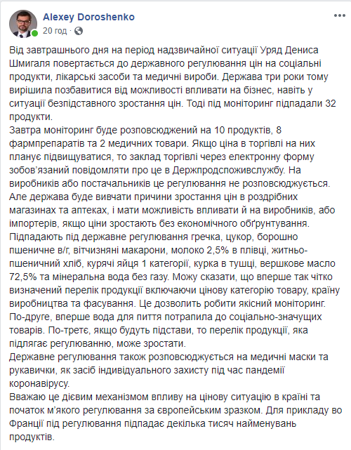 Кабінет міністрів відсьогодні повернувся до державного регулювання цін на соціальні продукти, лікарські засоби та медичні вироби. Про це повідомив у Facebook голова Національної ради економічного розвитку Олексій Дорошенко.