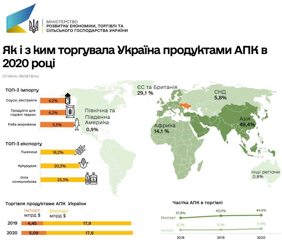 Заступник міністра розвитку економіки, торгівлі і сільського господарства України Тарас Висоцький оприлюднив інфографіку, у якій представлений зовнішньоторговельний обіг продукцією АПК у січні-жовтні 2020 року.