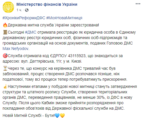 Державна митна служба отримала реєстрацію як юридична особа в Єдиному державному реєстрі на основі документів, поданих головою ДМС Максимом Нефьодовим.