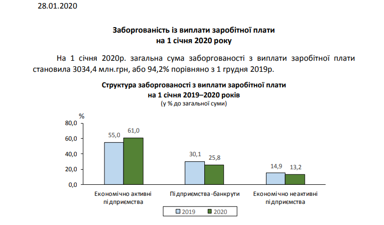 Повідомляється, що у грудні 2019 року сума заборгованості із зарплати економічно активних підприємств зменшилася на 9,3%. На 1 січня 2020 року ця сума складала 1,851 млрд грн.