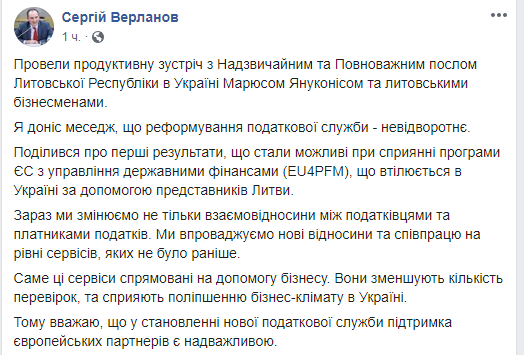 Також, за словами очільника ДПС, у становленні нової податкової служби підтримка європейських партнерів є надважливою. В ході зустрічі Сергій Верланов подякував Литовській Республіці за допомогу, зокрема, за провідну участь у впровадженні програми ЄС з управління державними фінансами в Україні (EU4PFM), одним з напрямів якої є реформа податкової служби в Україні.