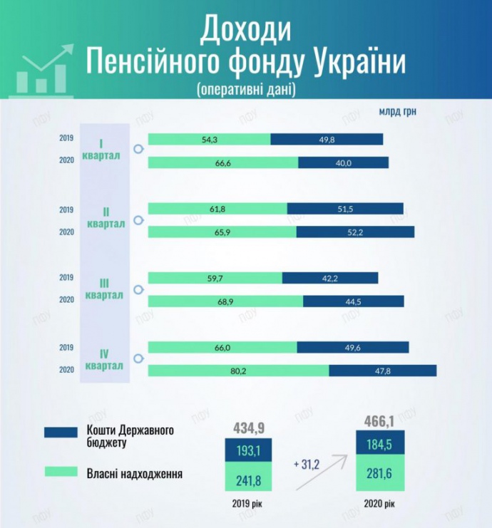 Відомо, що у 2020 році загальний дохід ПФУ становив 466,1 мільярд гривень, з них 281, 6 мільярда, тобто 60,4%, становили власні кошти. У порівнянні з 2019 роком загальні доходи у 2020 році збільшилися на 31,2 мільярда гривень, що складає 7%.