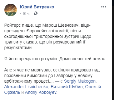"Ройтерс пише, що Марош Шевчовичї, віце-президент Європейської комісії, після сьогоднішньої тристоронньої зустрічі щодо транзиту сказав, що він розчарований її результатами. Я його прекрасно розумію. Домовленостей немає. Але я час не марнував, оскільки працював над позовними вимогами до Газпрому у новому арбітражному процесі", - написав Вітренко.