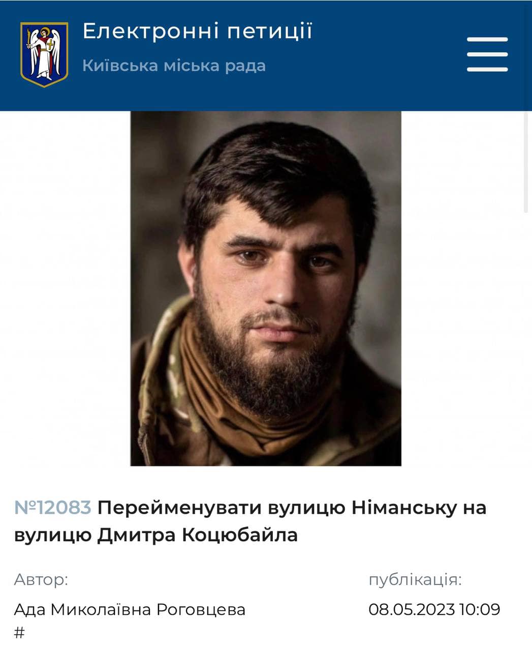 «Вулиця Німанська в Печерському районі міста Києва названа на честь річки Німан, що протікає Калінінградською областю росії. Російські топоніми не мають бути вшановані в міському просторі столиці України. Київ повинен шанувати Героїв, які віддали життя за Незалежність України. Я пропоную перейменувати вулицю Німанську на честь легендарного комбата 67-ї окремої механізованої бригади, керівника батальйону «Вовки Да Вінчі» Дмитра Коцюбайла «Да Вінчі», — написала вона.