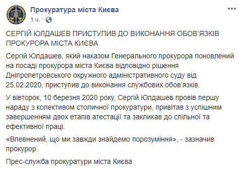 "Сергій Юлдашев, який наказом Генерального прокурора поновлений на посаді прокурора міста Києва відповідно рішення Дніпропетровського окружного адміністративного суду від 25.02.2020, приступив до виконання службових обов’язків. У вівторок, 10 березня 2020 року, Сергій Юлдашев провів першу нараду з колективом столичної прокуратури, привітав з успішним завершенням двох етапів атестації та закликав до спільної та ефективної праці", - йдеться у повідомленні прокуратури Києва.