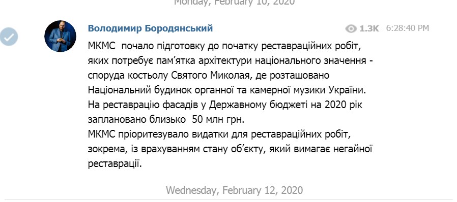 "МКМС розпочало підготовку до початку реставраційних робіт, в яких потребує пам'ятка архітектури національного значення - будівля костьолу Святого Миколая, де знаходиться Національний будинок органної та камерної музики України. На реставрацію фасадів у Державному бюджеті на 2020 рік заплановано близько 50 млн грн. МКМС пріоритезувати витрати для реставраційних робіт, зокрема, з урахуванням стану об'єкта, який вимагає негайної реставрації", - написав Бородянський.