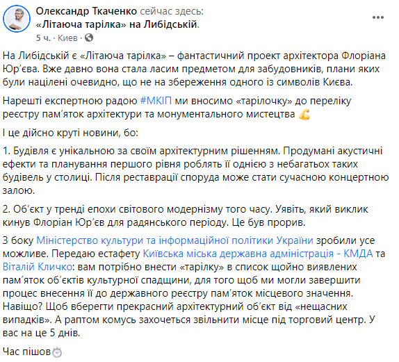 Міністерство культури та інформаційної політики вносить пам’ятку архітектури модернізму, так звану "Літаючу тарілку", яка розташована на Либідській площі в Києві, до реєстру пам’яток архітектури. Про це написав на свой сторінці у Facebook міністр культури та інформаційної політики Олександр Ткаченко. Міністр нагадав, що так звана "Літаюча тарілка" – фантастичний проєкт архітектора Флоріана Юр’єва, який вже давно став ласим предметом для забудовників, плани яких були націлені очевидно не на збереження одного із символів Києва.