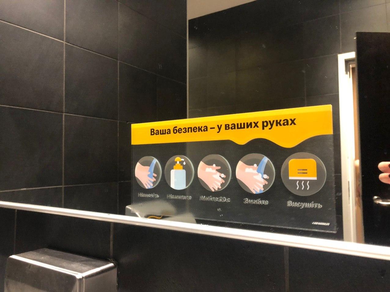 У центрі Києва на Хрещатику відкрив свої двері McDonald's. На вході співробітники пояснили правила: "Вхід виключно в масці, дезінфекція рук рекомендаційна. Вихід тільки через бічні двері, щоб люди менше контактували один з одним. За можливості, дотримуйтесь розмежувальних ліній в 1,5 метра біля каси по розмітці на підлозі, для вашої ж безпеки".