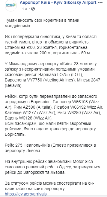 "Скасовані рейси: Варшава LO755 (LOT), Барселона VY7750 (Vueling Airlines), Мінськ 2847 (Belavia). Рейси, котрі були перенаправлені до запасного аеродрому в Бориспіль: Ганновер W66108 (Wizz Air), Рим AZ590 (Alitalia), Лісабон W66192 Wizz Air, Катовіце W1277 (Wizz Air), Рига W6280 (Wizz Air), Відень W6128 (Wizz Air)", - йдеться у повідомленні.