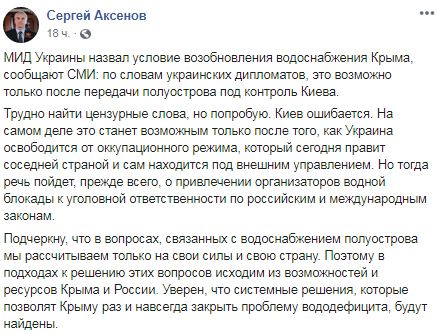 "Підкреслю, що в питаннях, пов'язаних з водопостачанням півострова ми розраховуємо тільки на свої сили та свою країну. Тому в підходах до розв'язання цих питань виходимо з можливостей і ресурсів Криму і Росії. Упевнений, що системні рішення, які дозволять Криму раз і назавжди закрити проблему вододефіциту, будуть знайдені", - повідомив він у соцмережі.