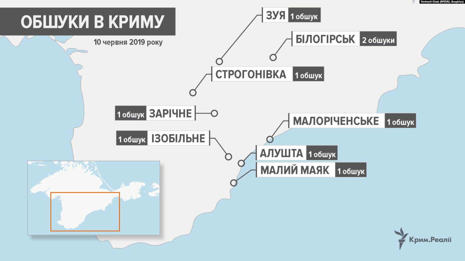Після ранкових обшуків у будинках кримських татар в Алуштинському, Білогірському та Сімферопольському районах анексованого криму 10 червня були затримані восьмеро чоловіків.