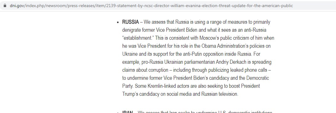 "Проросійський український парламентарій Андрій Деркач поширює заяви про корупцію, в тому числі за допомогою оприлюднення просочилися телефонних розмов - щоб підірвати кандидатуру колишнього віце-президента Байдена і Демократичної партії", - підкреслив Еванін.