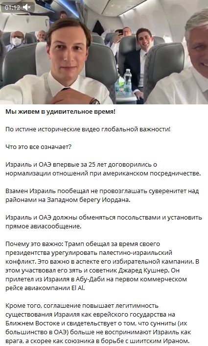 Ізраїль і Об'єднані Арабські Емірати вперше за 25 років домовилися про нормалізацію відносин при американському посередництві. Про це розповів у своєму Телеграм-каналі відомий український бізнесмен і меценат Павло Фукс. Ізраїль пообіцяв не проголошувати суверенітет над районами на Західному березі Йордану. Крім того, Ізраїль і ОАЕ мають обмінятися посольствами і встановити пряме авіасполучення.