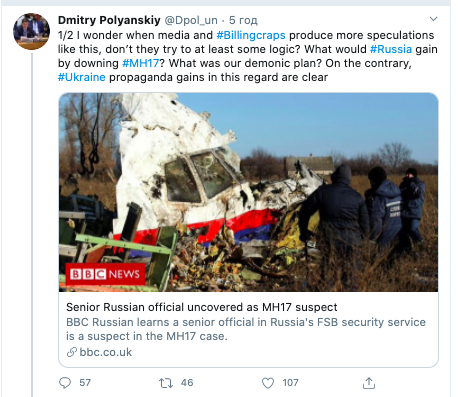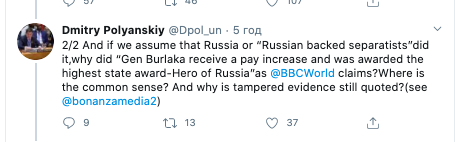 Перший заступник постійного представника Росії при ООН Дмитро Полянський заявив, що причетність російського генерала ФСБ Андрія Бурлаки до катастрофи рейса MH17 "позбавлені здорового глузду". Дипломат назвав авторів розслідування проти генерала ФСБ спекулянтами. Полянський задає питання "яку вигоду Росія отримала б, збивши MH17? У чому був наш диявольський план?".
