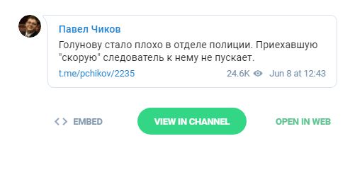 "Голунову стало погано у відділі поліції. Приїхала "швидку" слідчий до нього не пускає", - повідомляє в мережі Чиков