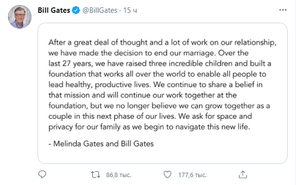 Гейтси розповіли світу, що після довгих роздумів і великої роботи над своїми відносинами вони ухвалили рішення розірвати шлюб. Гейтси зазначили, що виростили трьох прекрасних дітей і побудували фонд, який став спонсором багатьох ініціатив у сфері охорони здоров'я. Білл та Мелінда попросили у громадськості поважати особистий простір їх сім'ї, зазначивши, що вони тільки починають орієнтуватися в новому для них житті.