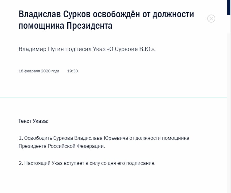 "Звільнити Суркова Владислава Юрійовича з посади помічника президента Російської Федерації. Цей указ набирає чинності з дня його підписання", - йдеться в тексті документа.