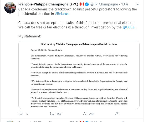В заяві глави канадського МЗС Франсуа-Філіпа Шампані йдеться, що уряд його країни вважає результати виборів у Білорусі – сфальсифікованими.