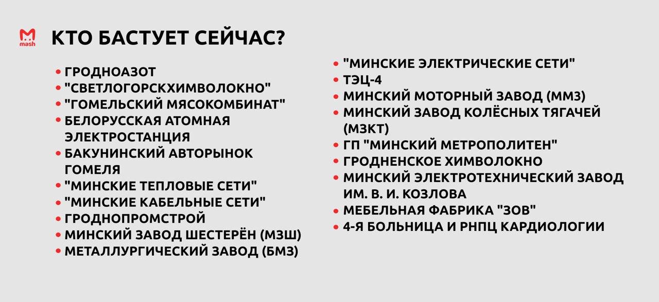 У Білорусі працівники багатьох підприємств по всій країні заявили про приєднання до загальнонаціонального страйку. Російський Telegram-канал Mash опублікував перелік підприємств, які приєдналися до страйку.