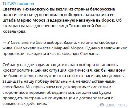Про це повідомляє TUT.BY з посиланням на довірену особу Тіхановської Ольгу Ковалькову. Ковалькова повідомила, що Тіхановській влада не залишила вибору. Їй довелося виїхати і головне, що вона жива і перебуває на волі. Однак, за словами Ольги Ковальковлї, частина команди Тіхановської зараз затримана правоохоронцями Білорусі.