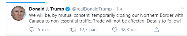 "Ми, за взаємною згодою, тимчасово закриємо наш північний кордон з Канадою для несуттєвих перевезень. На торгівлю це ніяк не вплине. Деталі будуть згодом!" - написав Трамп.