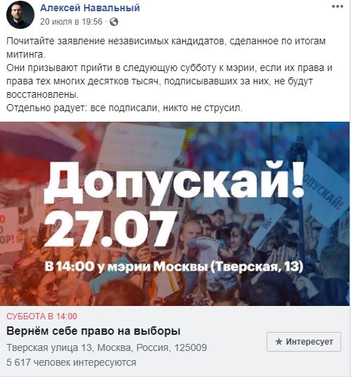 У соціальній мережі Навальний анонсував акцію протесту найближчої неділі, 27 липня.
