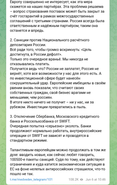 За словами заступника голови Ради безпеки РФ, санкції проти "Сбербанка", "Россельхозбанка" та "Московского кредитного банка" кардинально ситуацію не змінять. Медведєв запевняє, що російський банківський сектор продовжує працювати у звичному режимі, а внутрішньоросійські операції не залежать від міжнародної системи платежів SWIFT. У цьому контексті соратник Володимира Путіна закликав країни ЄС запроваджувати нові пакети санкцій. "Зважаючи на те, як діють обмеження і куди котиться економічна ситуація в ЄС на тлі безглуздих антиросійських страшилок, щось пішло не так", — резюмував Медведєв, коментуючи чергові обмеження щодо країни-агресора.